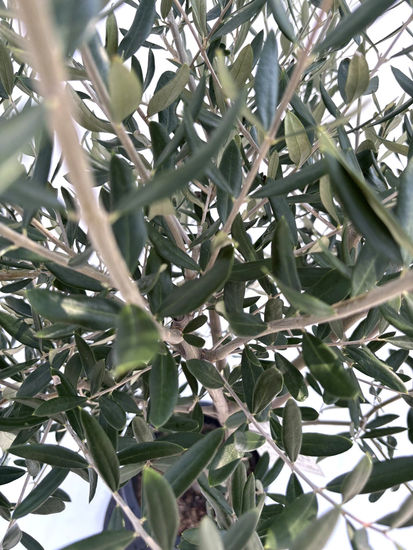 葉は濃い緑色で裏面は銀白色を帯び、やや厚みのある典型的なオリーブの葉。爽やかなコントラストが美しく、樹姿をより引き立てます。