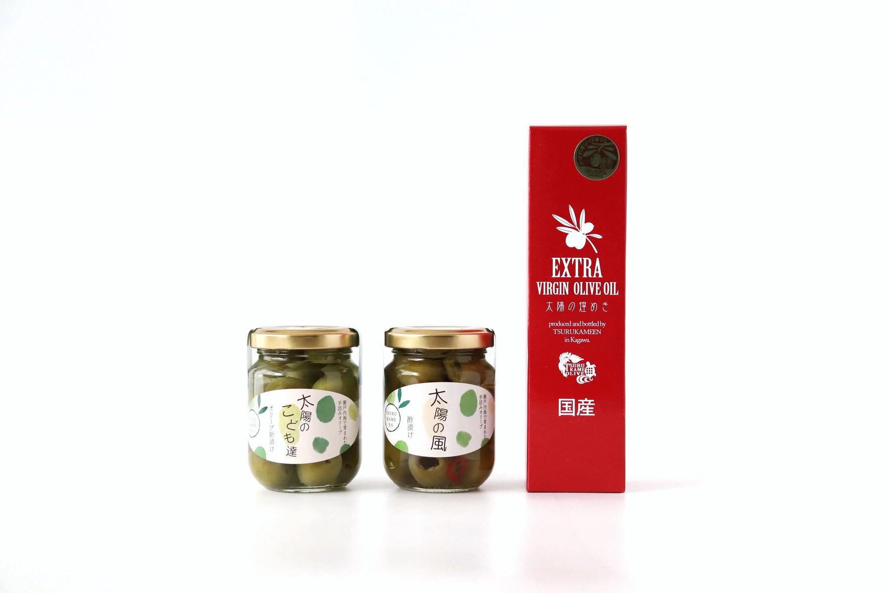 太陽をたっぷり浴びた香川県産オリーブを、自家搾油したオイルと、新漬け・酢漬けで詰め合わせました。