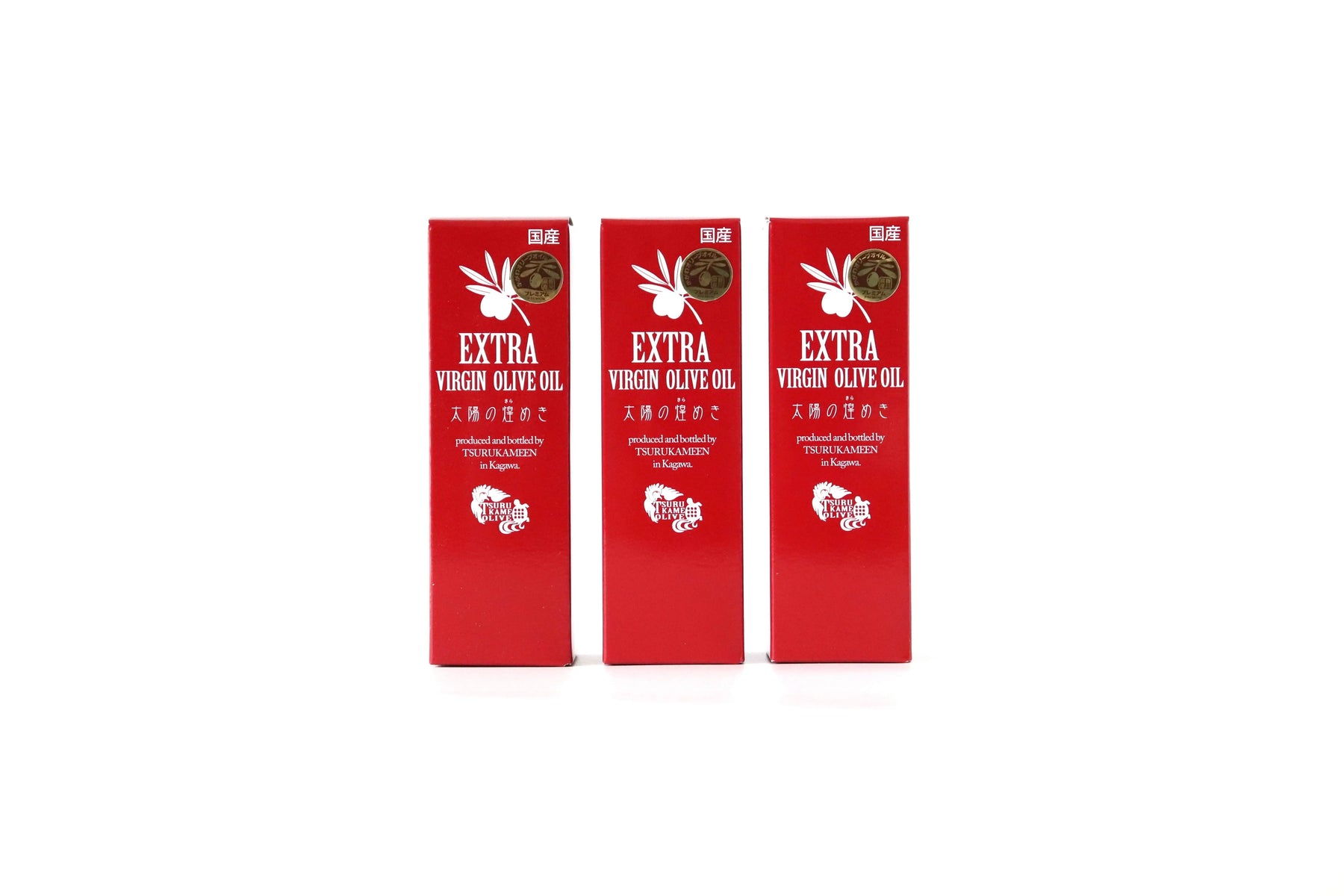 太陽のきらめきエクストラバージンオリーブオイル50ml・100ml・200mlボトル3本が並んだ写真